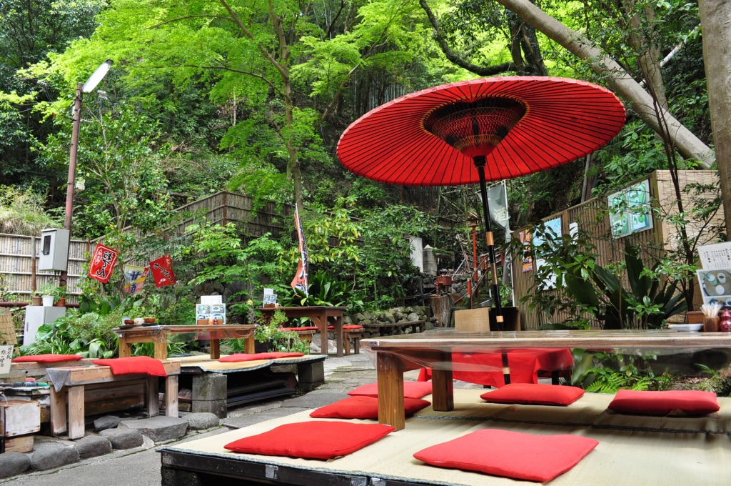 バス停や駐車場から滝へ向かう途中には、甘酒などの軽食を楽しめる茶屋や、