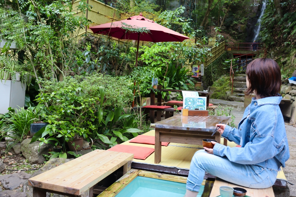 滝を眺めながら疲れを癒せる足湯があります。