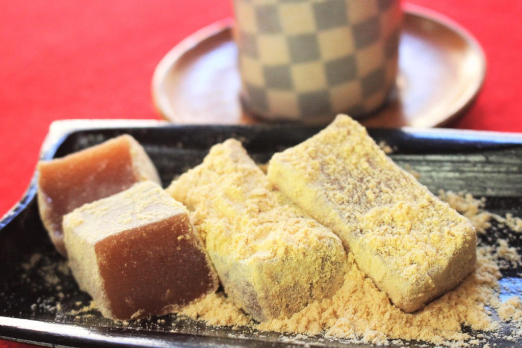 「きび餅」は、白豆粉、国産きび粉、白ざくろ、厳選した黄な粉のみで作られたヘルシーなおやつです。