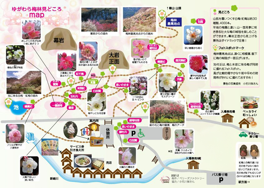 | 7日(土) ●オープニングセレモニー 湯河原梅林芸妓の舞 12:00~ 【雨天の場合、8日(日)の同時刻】 11日(水・祝) ●相洋高校和太鼓部による演奏 11:00~・13:30~【雨天中止】 14日(土) ●郷土芸能 焼亡の舞 13:00~ ●無料ガイドの日【雨天中止】 15日(日) ●民謡×津軽三味線和の響宴(観光大使 小山みつなwithスペシャルゲスト) 13:00~【雨天の場合、同時刻、湯河原大屋根広場】 ●無料ガイドの日【雨天中止】 21日(土) ●キッズダンスOSD 10:30~11:30・13:00~14:00 ●DJ MIDORI’s “ALOHA SATURDAY” 11:00~14:00 【雨天中止】 ●鎧体験 10:00~14:00 22日(日) ●湯河原梅林オリジナル染物体験 10:00~14:00【雨天中止】 ●創作和太鼓集団「衆」による演奏 10:30~ ●吟と舞<緑萼会> 13:00~ ●フラワーアレンジメント「花の学校」(有料) ●河津桜と梅ハイキング【事前申込制・雨天中止】(有料) 23日(月・祝) ●湯河原温泉芸妓の舞 12:00~ ●梅林寄席【荒天中止・小雨決行】13:30~ 28日(土) ●カ フアカイ フラスタジオ「春を呼ぶフラダンス」 11:00~【雨天中止】 ●幕山の音色(箏の演奏) 13:30~【雨天中止】 ※イベントは、出演者の都合により変更する場合がございます。ご了承ください。 | 1日(日) ●民謡×津軽三味線和の響宴(観光大使 小山みつなwithスペシャルゲスト) 13:00~【雨天の場合、同時刻、湯河原大屋根広場】 7日(土) ●湯河原ウクレレパーティ@梅の宴 10:00~11:30 【雨天の場合、湯河原駅大屋根広場】 ●梅林狂言 13:30~【雨天の場合、湯河原芸妓屋組合】 8日(日) ●梅林狂言 13:30~【雨天の場合、湯河原芸妓屋組合】 ※イベントは、出演者の都合により変更する場合がございます。ご了承ください。 |